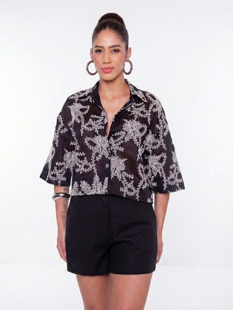 Camisa Cropped Liocel Bordada - Preto - Alto Verão 2026 capsula 12