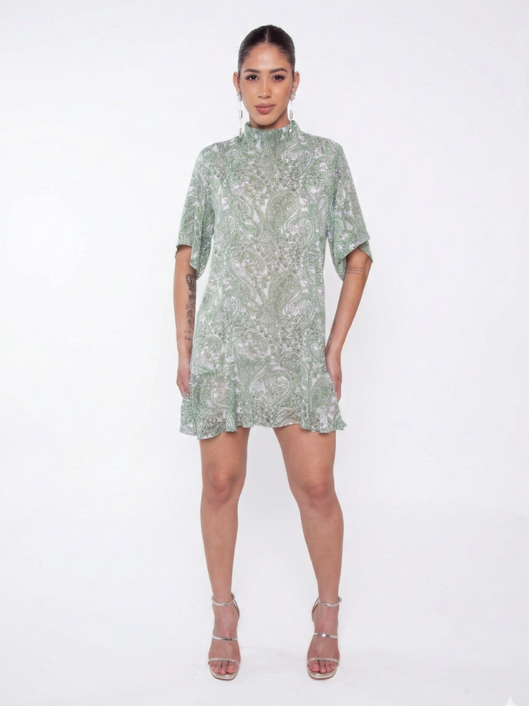 Vestido Curto Gola Alta Chiffom Estampad - Bege - Alto Verão 2026