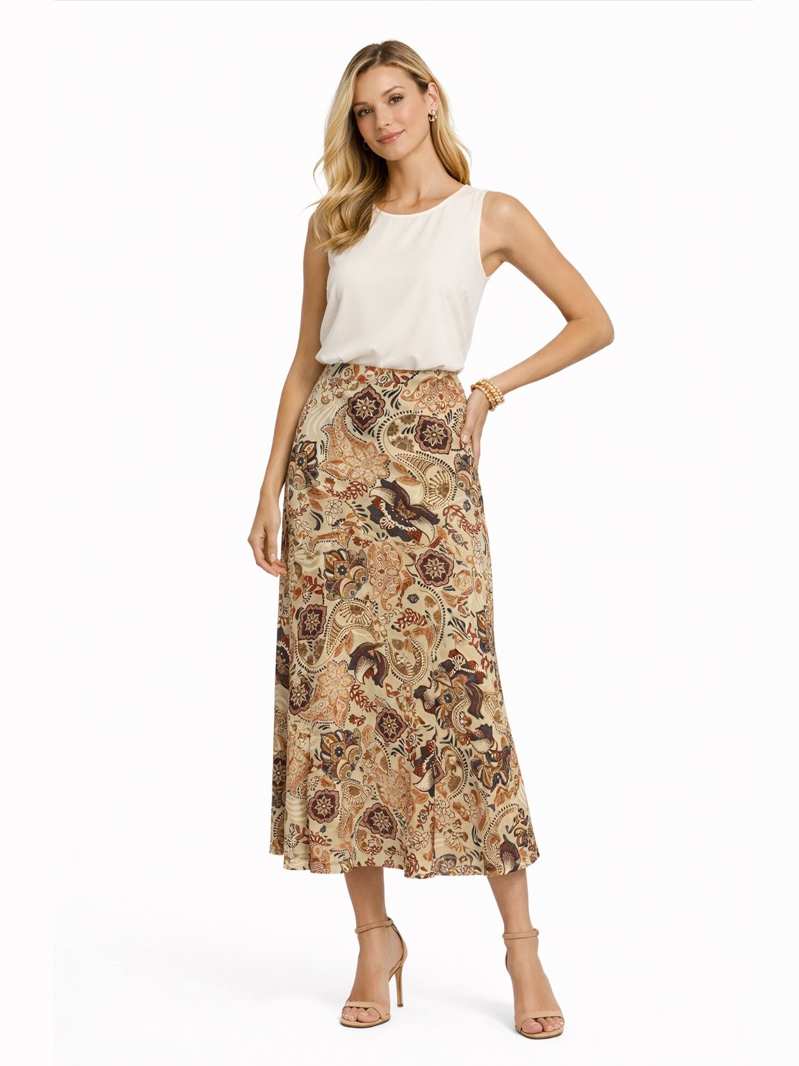 Saia Midi Recortes Estampada Viscose - Bege - Alto Verão 2026 capsula 12