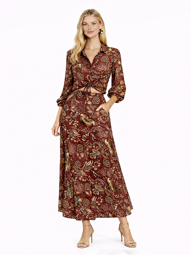 Saia Midi Recortes Estampada Viscose - Bege - Alto Verão 2026 capsula 12