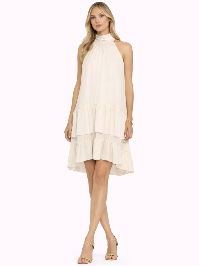Vestido sem mangas com gola alta e saia em camadas de babados. Caimento fluido, tecido leve e acabamento minimalista para eventos formais.