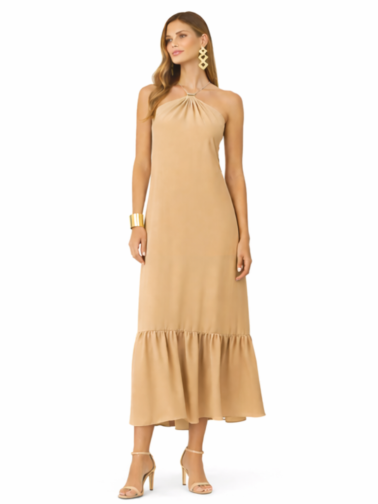 Vestido feminino bege com decote halter franzido, alças finas cruzadas nas costas e amarração ajustável. Modelagem fluida com babado na barra que confere leveza e charme ao visual. Ideal para dias quentes e produções elegantes de verão.