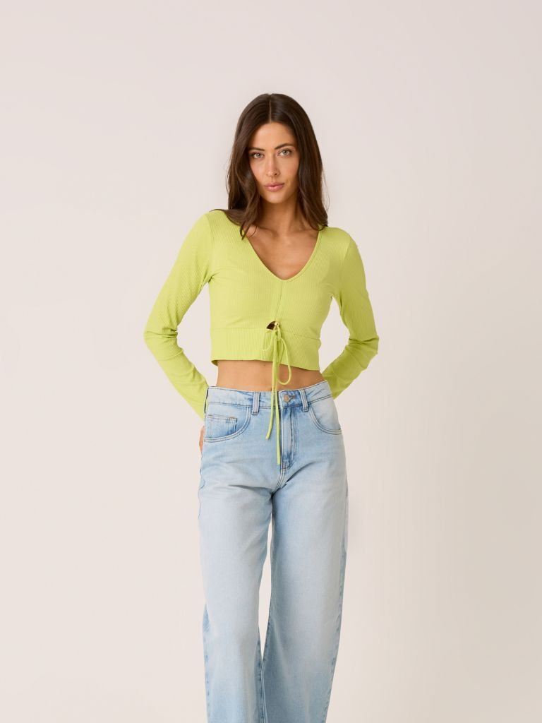 A blusa cropped verde-limão é confeccionada em tecido canelado de alta elasticidade, proporcionando ajuste confortável ao corpo. Possui mangas longas e decote V profundo, valorizando o colo com elegância. O detalhe frontal de amarração com cordões ajustáveis permite personalizar o caimento e adiciona um toque moderno e feminino à peça.