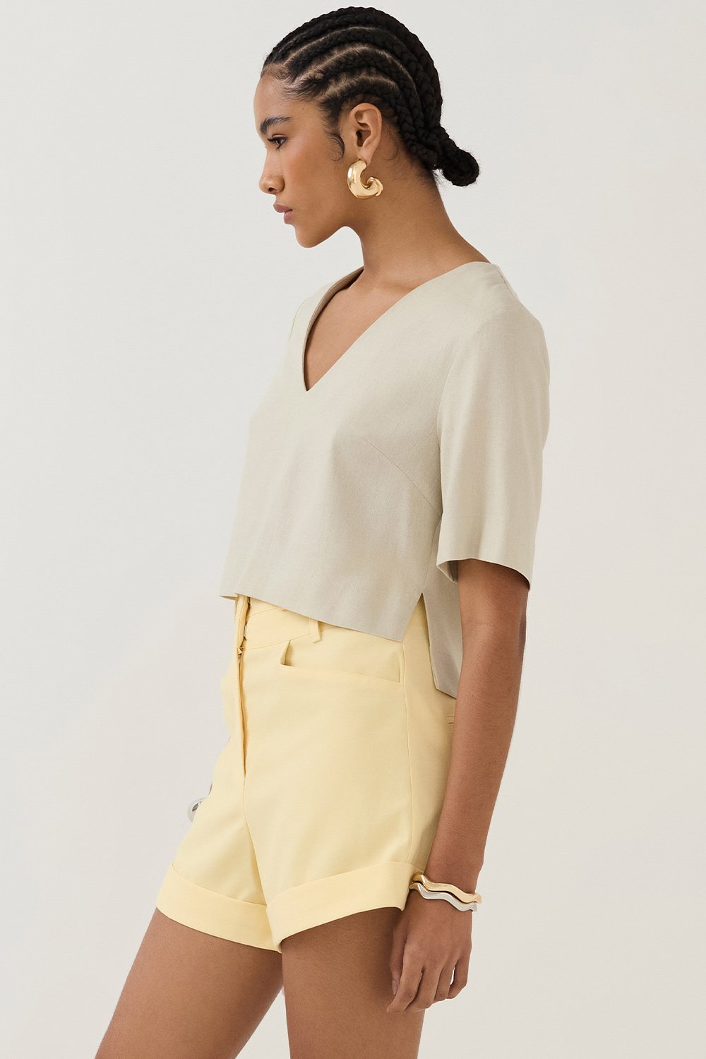 Blusa de linho cropped em tecido leve de linho que garante um maior frescor e conforto por se tratar de uma fibra mais natural. Possui decote V e mangas curtas soltas, garantindo conforto e elegância. Com corte minimalista e caimento soltinho com a parte traseira levemente mais alongada. É uma peça versátil que combina facilmente com diferentes estilos. Ideal para composições casuais e sofisticadas, perfeita para os dias mais quentes.