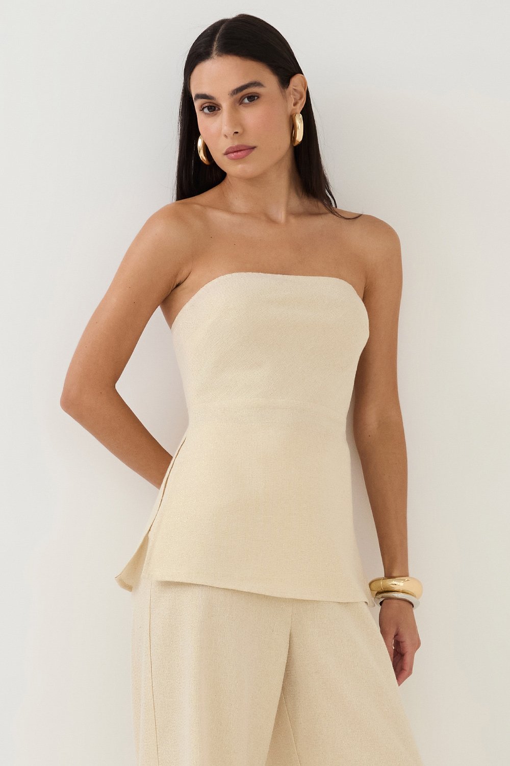 Para quem procura um visual atemporal e cheio de personalidade, a Blusa Sem Alças Algodão com Lurex é uma escolha irresistível! Com um design "tomara que caia" que valoriza a silhueta de maneira delicada, essa peça possui um corte que contorna o busto e desce mais solta, trazendo leveza e movimento, acentuados pelas fendas laterais que conferem um toque moderno e discreto.