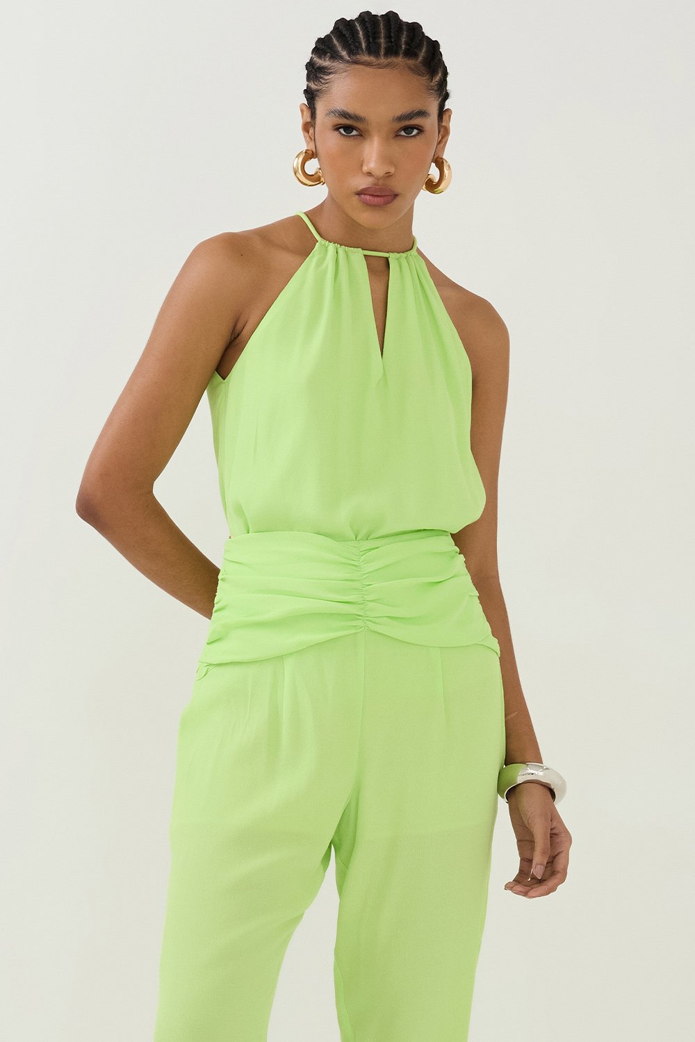 A Blusa Sem Manga Decote V possui um corte impecável, com decote halter em V e uma charmosa abertura frontal que traz um toque de leveza ao look. Nas costas, o detalhe de amarração ajustável com ponteiras douradas dá um ar sofisticado e permite um ajuste personalizado para maior conforto.