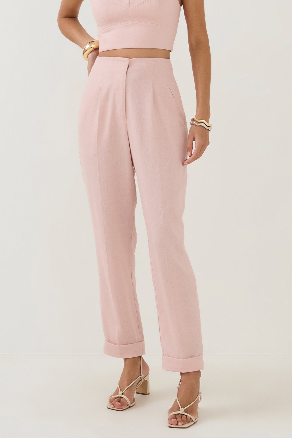 Calça de alfaiataria confeccionada em linho, com detalhe de pregas que agregam um toque de elegância ao design. Apresenta barra italiana, que traz um acabamento mais sofisticado. O fechamento é feito por colchetes e zíper, oferecendo praticidade e um visual limpo. A calça possui bolsos faca, que adicionam funcionalidade e um charme adicional ao modelo. Perfeita para compor looks clássicos e modernos.