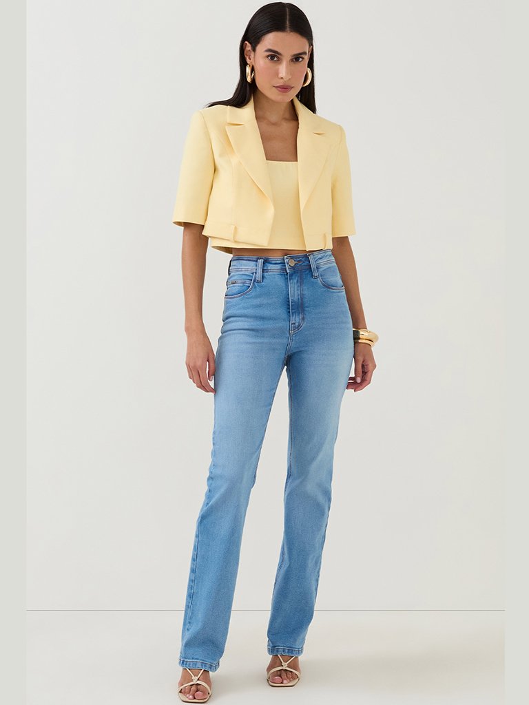 A Calça Jeans Pamela possui um design de cintura alta que valoriza a silhueta e oferece um caimento impecável. Seu corte reto é clássico e atemporal, proporcionando uma aparência alongada às pernas e uma sensação de liberdade de movimento.