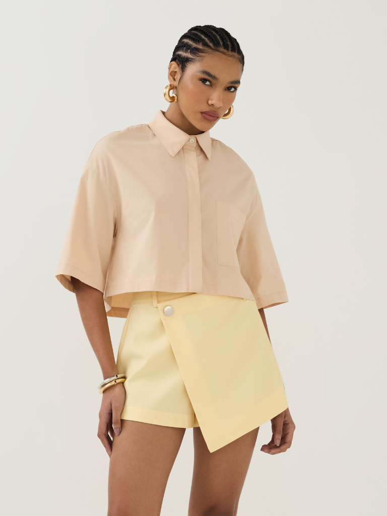 A camisa cropped possui um design minimalista e sofisticado, com modelagem solta e mangas curtas oversized. Feita em tecido leve e confortável, a peça conta com gola clássica e fechamento por botões escondidos na vista frontal, proporcionando um acabamento limpo, além de um bolso frontal.