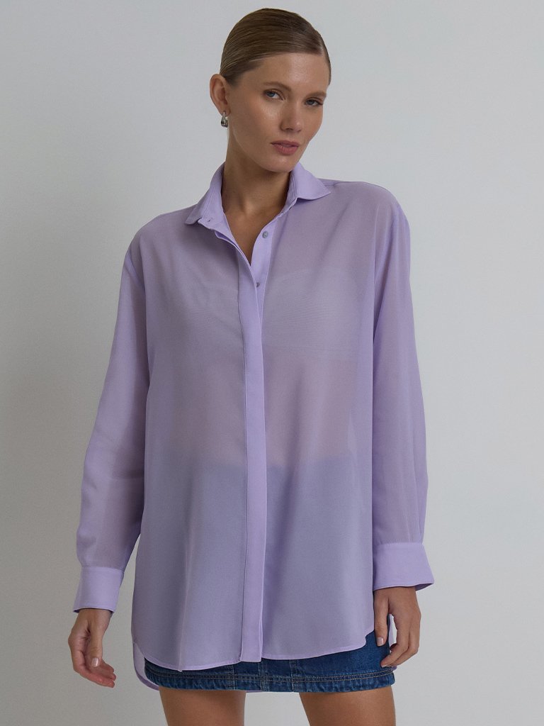 A Camisa Social com Transparência possui modelagem Oversized e colarinho tradicional com entretela. Confeccionada em tecido fluído de Chiffon, a camisa apresenta uma leve transparência. Possui vista coberta, deixando o visual minimalista. Além disso, conta com punhos quadrados e botões casquinha de madrepérola. Nas costas conta com penses estratégicas, garantindo um caimento mais adequado a silhueta. A camisa de Chiffon com transparência é a peça-chave para composições versáteis. Para um visual casual chic, combine com jeans reto, mule e acessórios delicados. No estilo clássico, aposte na alfaiataria com blazer e scarpin em tons neutros. Já para um toque despojado, use com bermuda ou saia midi, tênis branco e bolsa tiracolo, garantindo modernidade e leveza ao look.
