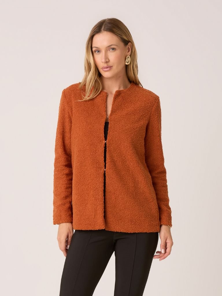 Casaco texturizado com modelagem reta e fechamento frontal por colchetes.