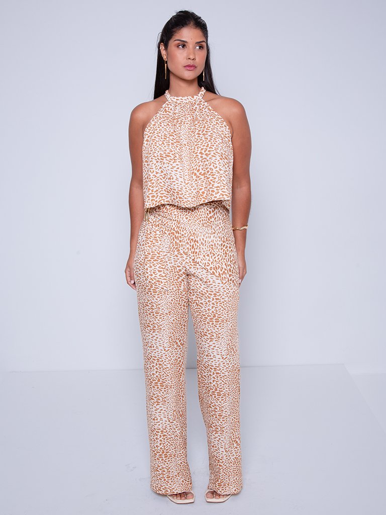 Calça de cintura alta com estampa animal print em tons de bege e branco, confeccionada em tecido leve e fluido. Ideal para compor looks modernos e sofisticados.