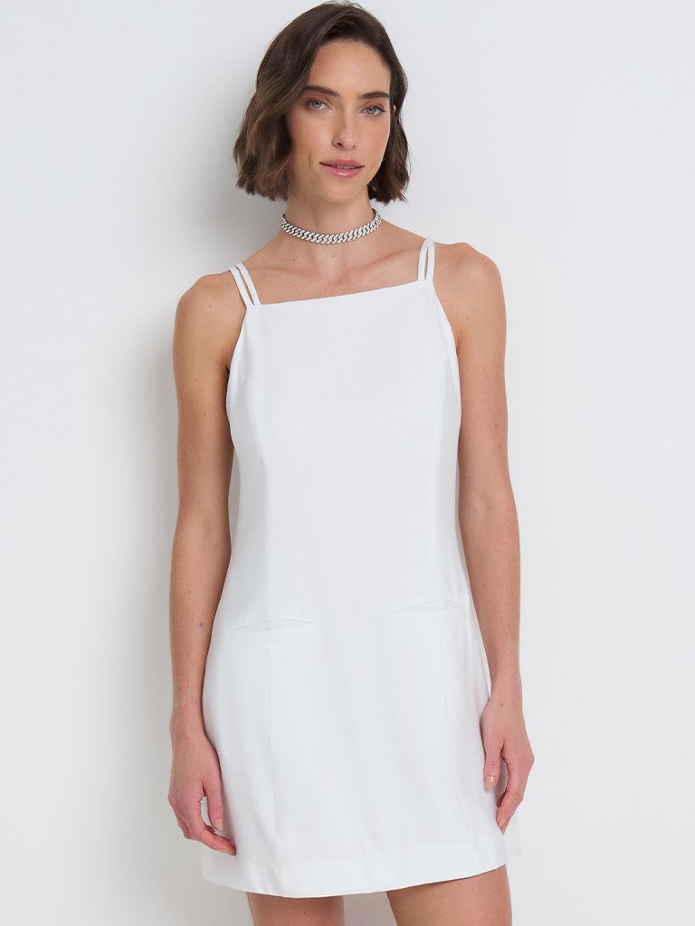 Para quem busca funcionalidade com uma pegada moderna, o vestido curto branco com alça dupla é a escolha certa. O zíper tratorado nas costas confere atitude ao visual clean, enquanto os bolsos frontais e o corte reto trazem um ar prático e estiloso. Combine com tênis, mocassins ou até uma terceira peça como jaqueta cropped para compor produções urbanas com frescor e elegância.
