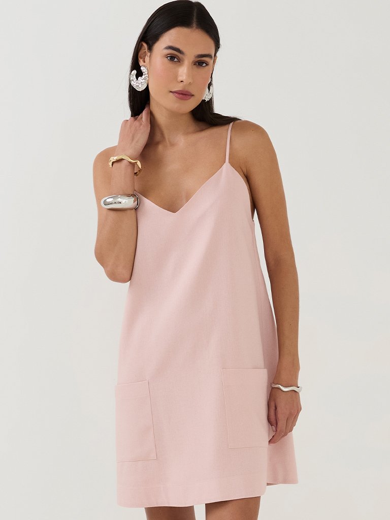 O vestido curto em linho combina conforto e estilo em uma peça versátil. Com alças finas ajustáveis e decote em V, ele oferece uma modelagem leve, ideal para dias de descontração. Os dois bolsos frontais adicionam praticidade ao design, completando o visual com um toque funcional e moderno.