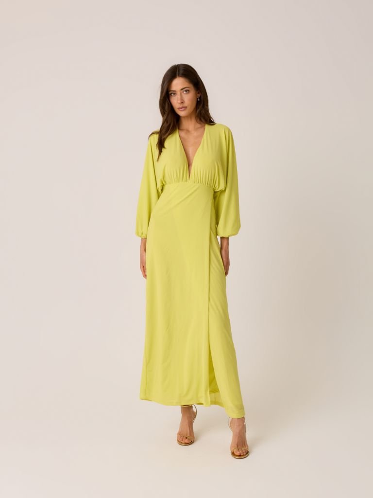 Com uma cor marcante e caimento elegante, o vestido longo verde é ideal para produções especiais. Possui decote profundo, mangas bufantes com punho ajustado e fenda transpassada que valoriza a silhueta com sofisticação. Um look statement perfeito para ocasiões especiais e festas.