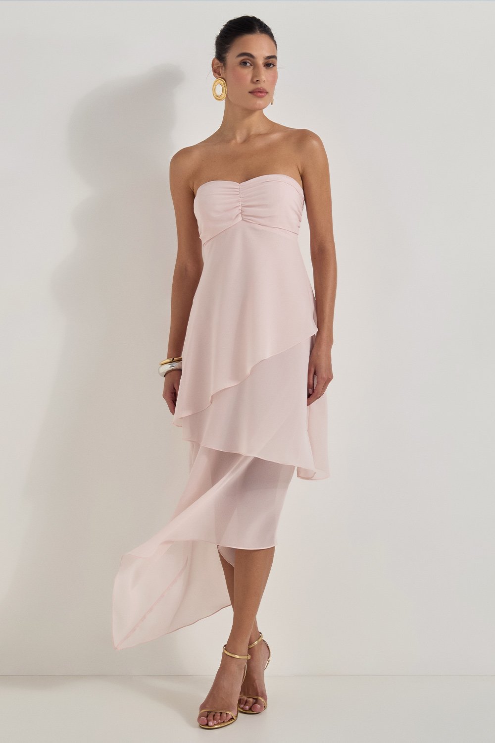Vestido tomara que caia longuete com franzido delicado no busto, traz um visual elegante e fluido. O design assimétrico da saia em camadas cria um efeito leve e sofisticado, ideal para ocasiões especiais. O detalhe de elastex nas costas garante melhor ajuste e conforto ao corpo, proporcionando praticidade sem perder a elegância. A combinação perfeita entre caimento impecável e um toque contemporâneo.