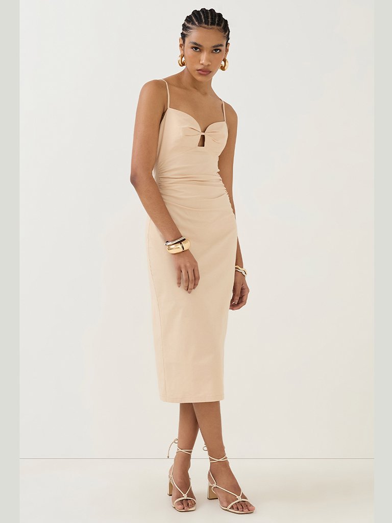 O vestido midi de tricoline apresenta uma modelagem ajustada ao corpo com alças finas e delicadas, oferecendo um visual elegante e minimalista. Possui um decote coração com um pequeno recorte no centro, além de franzidos que ajudam a valorizar a silhueta. O vestido conta com um detalhe de amarração nas costas, proporcionando ajuste perfeito à cintura. A peça é confeccionada em tecido leve, ideal para ocasiões especiais ou eventos sociais.