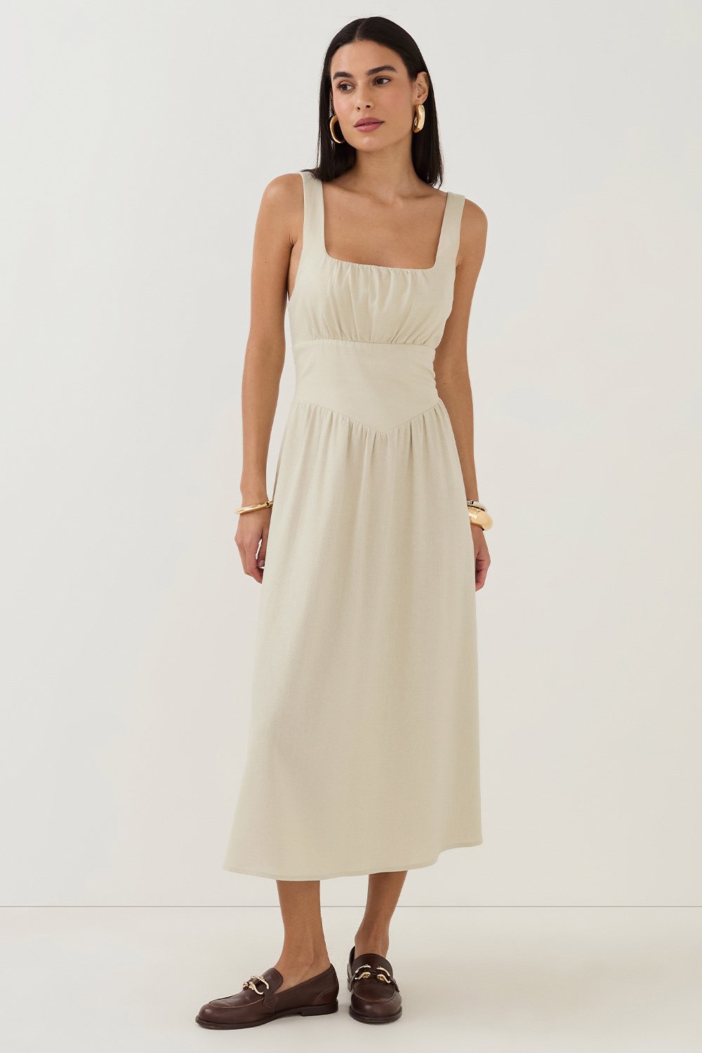 O vestido midi com pala e busto franzido traz um design elegante e delicado. O detalhe do franzido no busto valoriza a região, enquanto o elastex nas costas oferece conforto e ajuste perfeito. O zíper invisível garante praticidade, complementando a peça com um acabamento impecável. Ideal para ocasiões especiais, une estilo e conforto em uma única peça.