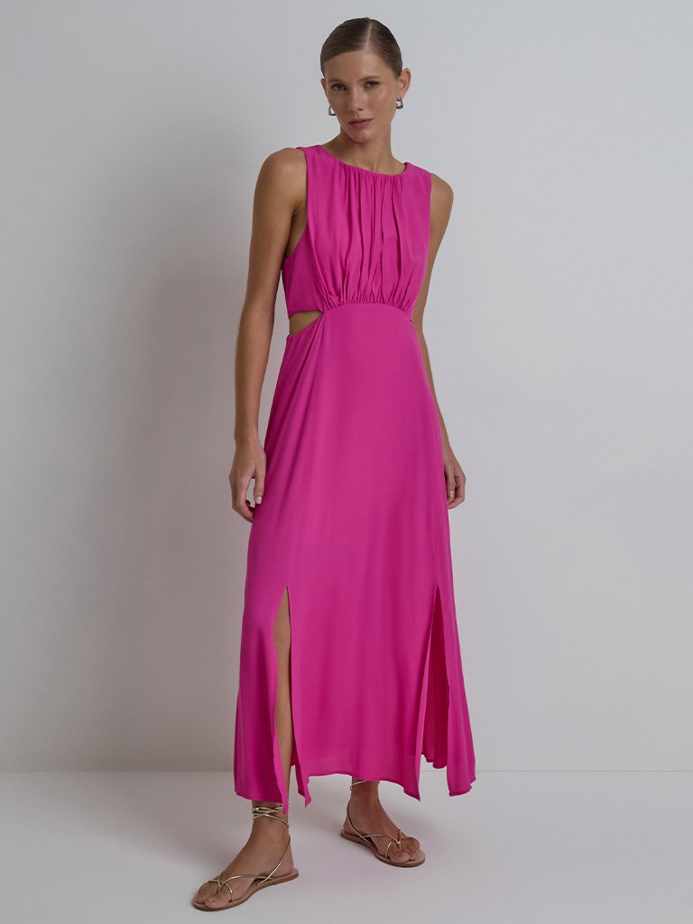 O Vestido Midi Cut Out é desenvolvido em tecido leve e fluído de viscose com forro, garantindo maior conforto. Sua modelagem conta com recortes laterais na cintura e fendas frontais, que além de trazer um toque especial, garante uma maior liberdade nos movimentos. O destaque especial fica por conta do drapeado frontal, na região do busto, e a moderna abertura costas com faixa para amarração, possibilitando diversas formas de uso. O vestido Cut Out é um modelo prático e confortável que pode ser usado no dia a dia ou passeios em finais de semana.