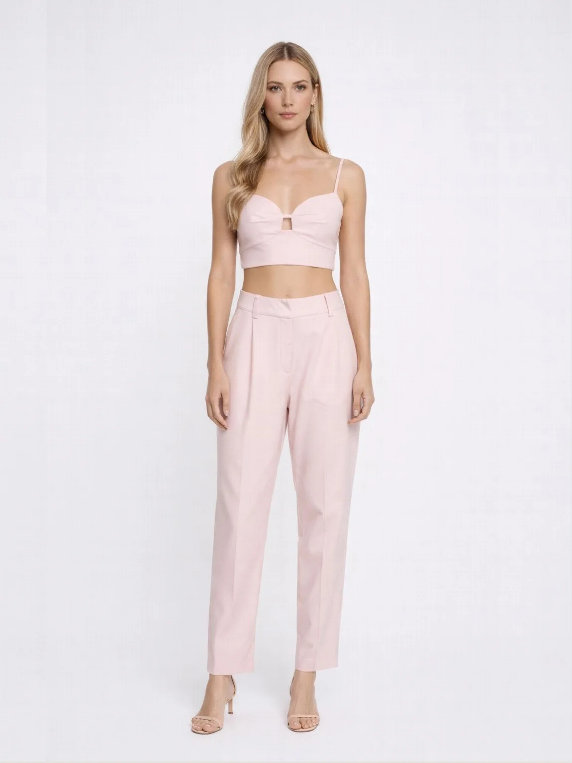 Calça de alfaiataria em tom bege claro, confeccionada em tecido leve e estruturado para um caimento elegante. Apresenta cintura alta que valoriza a silhueta, pregas frontais e modelagem levemente afunilada nas pernas, garantindo conforto e estilo em diferentes ocasiões.
