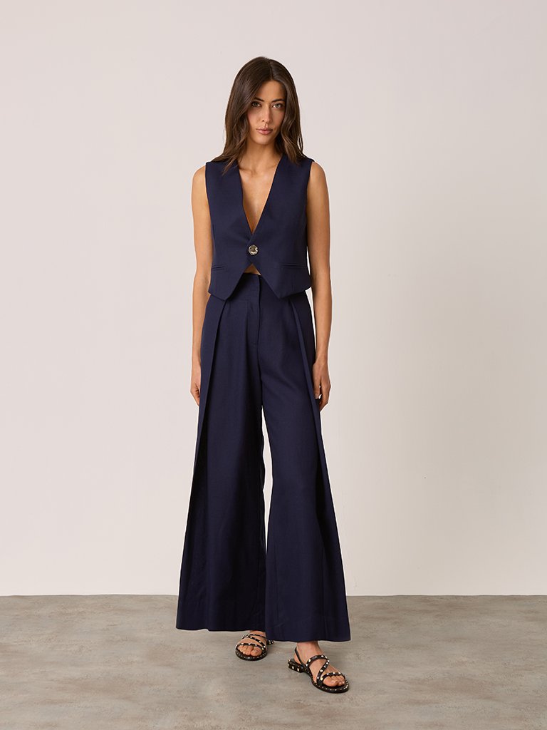 - Detalhes: Pregas frontais e cós com passantes