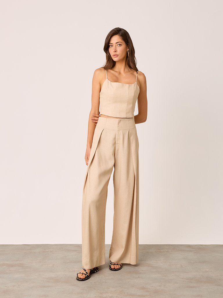 Calça de alfaiataria em tom bege claro, confeccionada em tecido leve e estruturado. Ideal para compor looks sofisticados e modernos com conforto.