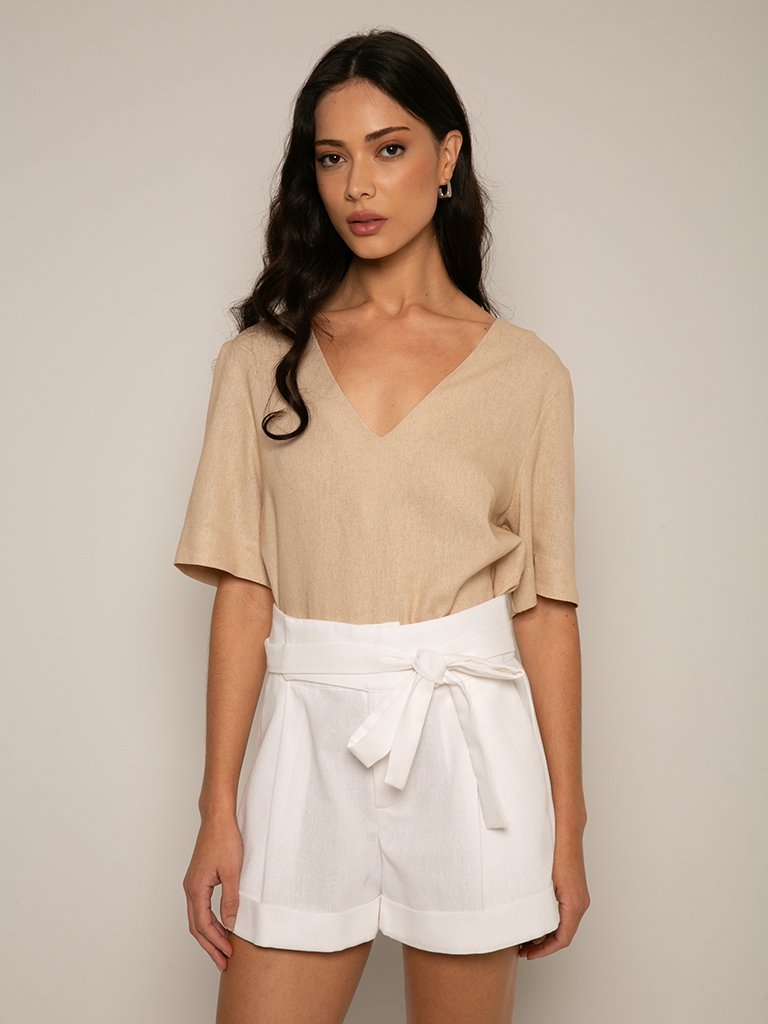 Shorts branco de cintura alta, confeccionado em tecido leve e estruturado. Ideal para compor looks frescos e elegantes com praticidade e estilo.