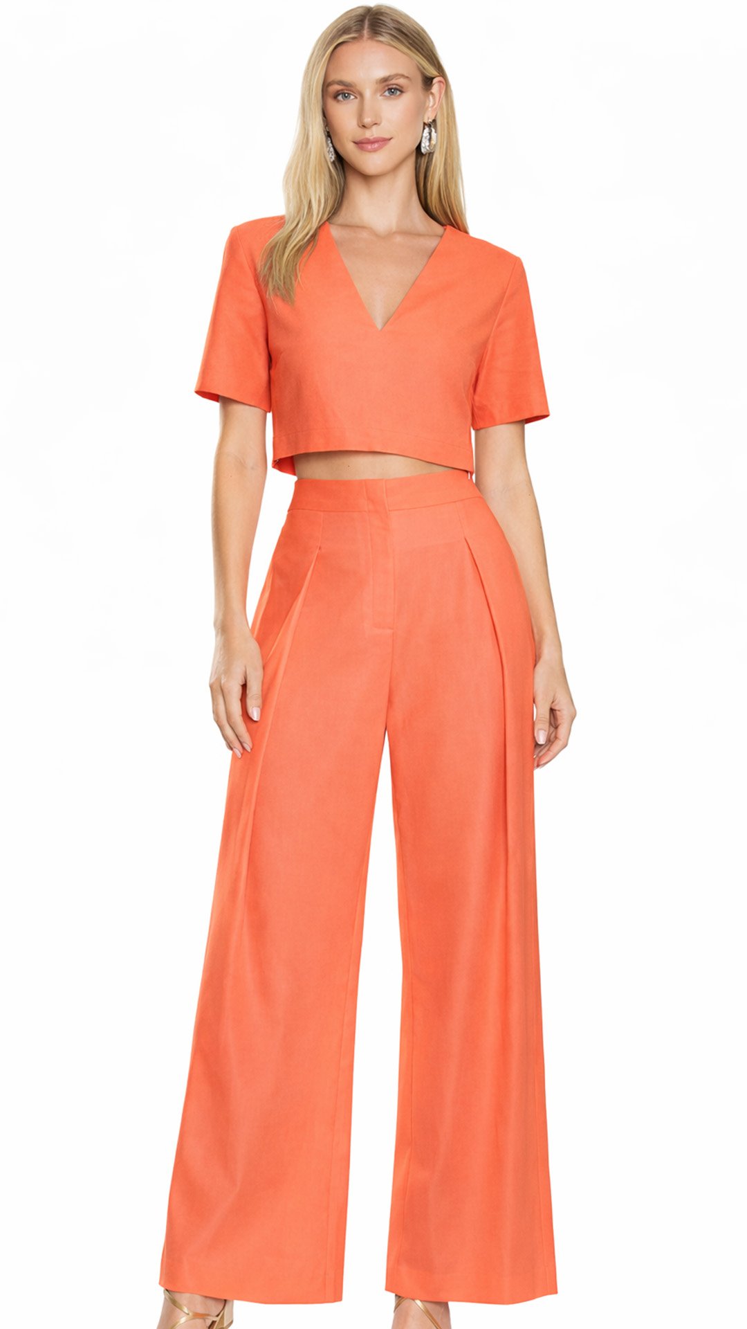 Frescor com estilo. Este top cropped coral é a peça ideal para composições leves e modernas. Com mangas curtas, decote em V e modelagem ajustada, ele valoriza o colo e traz conforto para os dias quentes. O comprimento cropped permite combinações versáteis com peças de cintura alta, criando looks casuais ou fashionistas com facilidade.