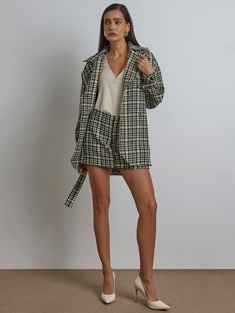 O novo Trench Coat Xadrez trouxe um design elegante a temporal ao mesmo tempo, confeccionado em Tweed Premium com padronagem Xadrez, nas cores Preto e off White. Ideal para ambientes corporativos, eventos ou produções de meia-estação com toque refinado. Um Trench Coat feminino sofisticado que une funcionalidade, conforto e moda com personalidade. Combine o Trench Coat Preto com a saia no mesmo tecido e crie um conjunto sofisticado e marcante. Para uma proposta elegante, aposte em peças de alfaiataria nos complementos. Já para um visual casual chic, o jeans é o par perfeito — equilibrando a estrutura do tweed com um toque descomplicado.