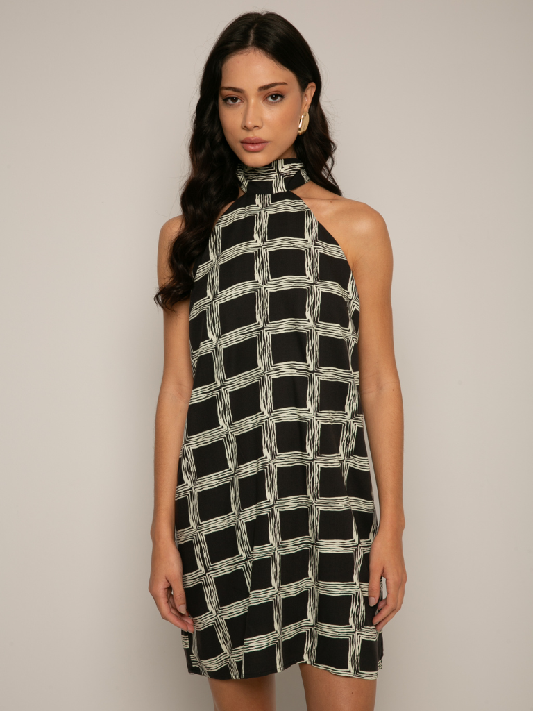 🖤 Vestido Curto com Faixa – Estampa Xadrez Preto e Branco | Look Urbano e Sofisticado