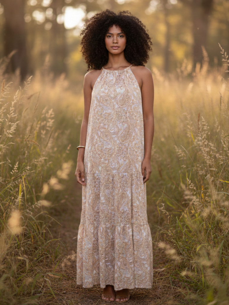 Vestido Longo Recorte Chiffon Boho Paisl - Alto Verão 2026 - Vestido - Bege - 100% Poliester