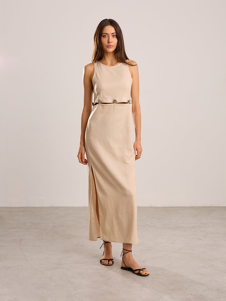Vestido longo em tom bege, confeccionado em tecido leve e fluido. Ideal para compor looks elegantes e modernos com conforto e sofisticação.