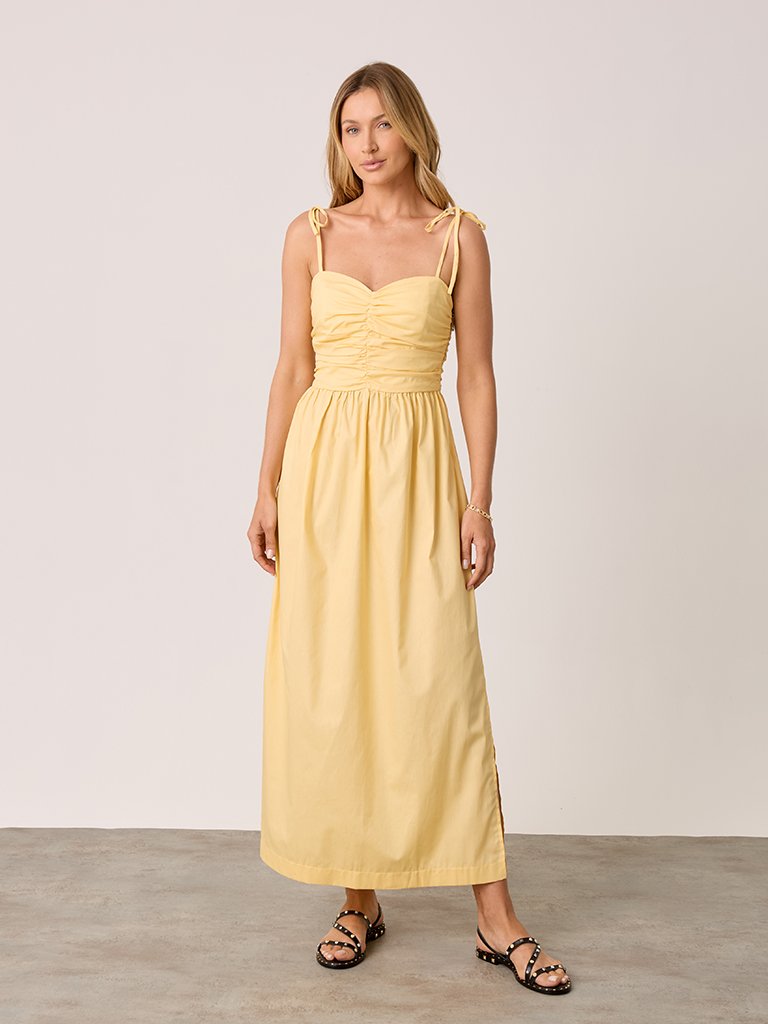 O vestido vermelho midi é confeccionado em tecido leve com caimento fluido. Possui alças finas com laços ajustáveis nos ombros, decote coração com franzido no busto e cintura marcada. A saia evasê com fenda lateral garante movimento e feminilidade. Ideal para composições elegantes e frescas no verão.