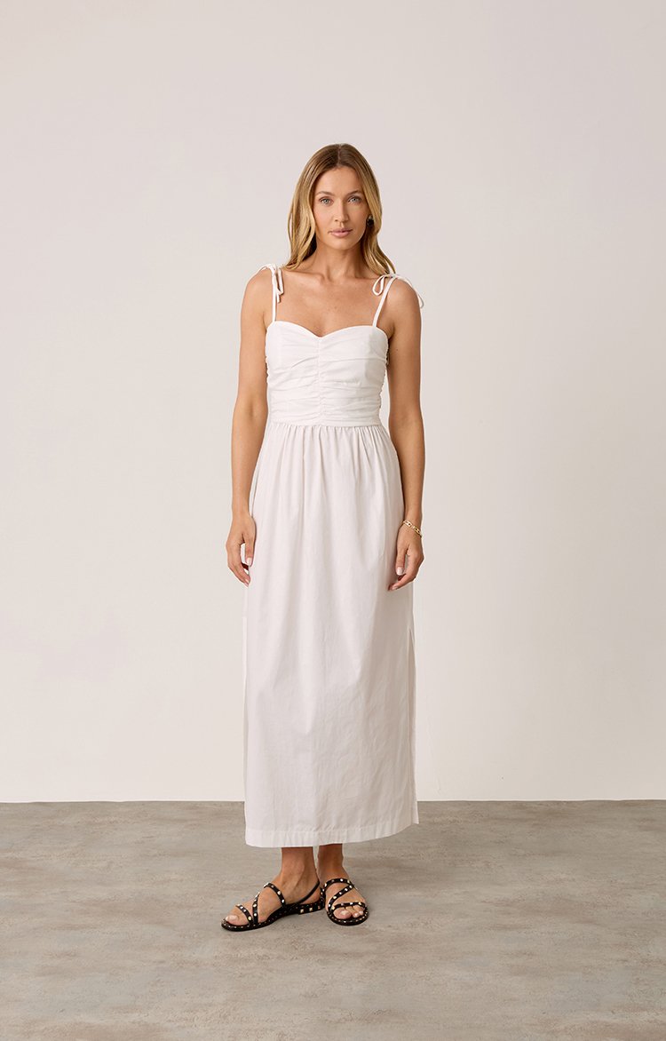 O vestido vermelho midi é confeccionado em tecido leve com caimento fluido. Possui alças finas com laços ajustáveis nos ombros, decote coração com franzido no busto e cintura marcada. A saia evasê com fenda lateral garante movimento e feminilidade. Ideal para composições elegantes e frescas no verão.
