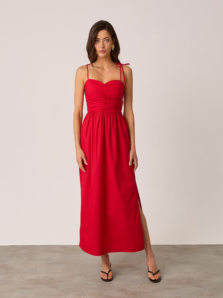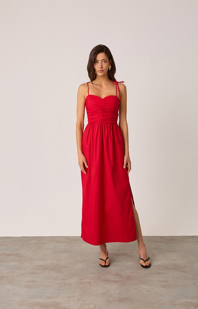 O vestido vermelho midi é confeccionado em tecido leve com caimento fluido. Possui alças finas com laços ajustáveis nos ombros, decote coração com franzido no busto e cintura marcada. A saia evasê com fenda lateral garante movimento e feminilidade. Ideal para composições elegantes e frescas no verão.