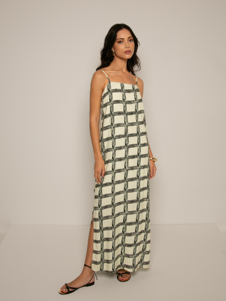 Minimalismo com impacto visual. Este vestido midi feminino traz uma proposta sofisticada e moderna com sua estampa geométrica em preto e branco. Com alças finas e modelagem fluida, ele oferece conforto e estilo para diversas ocasiões — do passeio casual ao evento noturno.