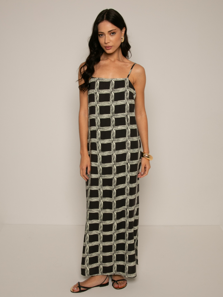 Minimalismo com impacto visual. Este vestido midi feminino traz uma proposta sofisticada e moderna com sua estampa geométrica em preto e branco. Com alças finas e modelagem fluida, ele oferece conforto e estilo para diversas ocasiões — do passeio casual ao evento noturno.