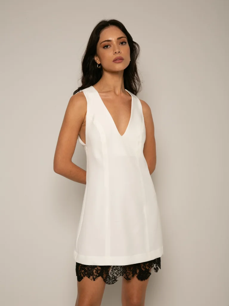 Este vestido curto feminino com renda preta é a escolha perfeita para quem busca um visual marcante e sofisticado. Com decote profundo em V, alças finas e barra com acabamento em renda, ele valoriza a silhueta com sensualidade e leveza. Disponível nas cores rosa vibrante e branco clássico, é ideal para eventos noturnos, festas ou produções ousadas.